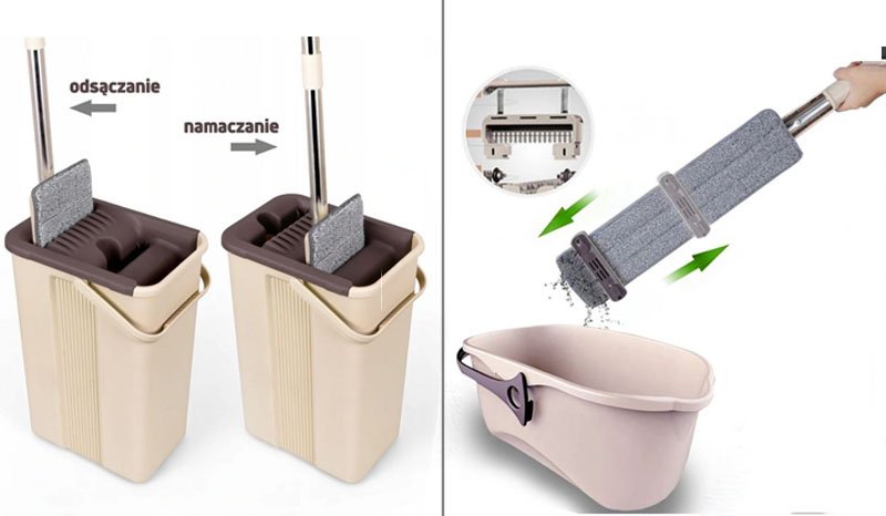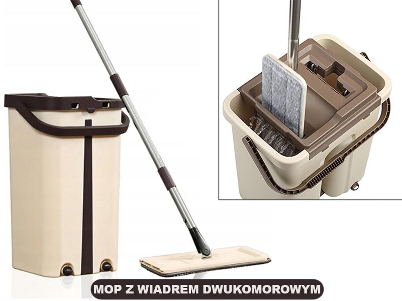 Mop wyposażony jest w dwukomorowe wiadro z wyciskaczem. Innowacyjny system dwóch zbiorników pozwala na ciągłą pracę bez konieczności wymiany wody – pierwszy służy do płukania, drugi natomiast do wyciskania nakładek. Nawet jeśli sprzątanie, nie należy do Twoich ulubionych zajęć, z pewnością błyskawicznie polubisz ten innowacyjny sprzęt czyszczący.